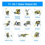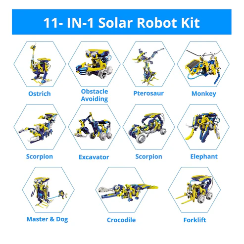 The 11 in 1 STEM Solar Robot kits for kids 8-12 can be built in 11 different shapes of robots which can move on land, including 4 vehicle models and 7 animal models: Obstacle Avoiding Rover, Buggy, Excavator, Forklift, Elephant, Crocodile, Pterosaurs, Dog-Walker, Monkey, Ostrich, Scorpion. Children can choose the shape they like and use their infinite imagination to build and create their stem robot toys.