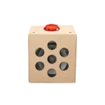 - Let’s put it all together! Take the cardboard box you assembled earlier and find the side with the seven-speaker holes. Slide the cardboard frame + hardware into the cardboard box, making sure that the speaker is aligned with the box side with the speaker holes.