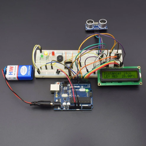 This project gives me the info I need about the water level in a water tank. When the level is low, the green LED is ON. When the level is medium, the yellow LED is ON. When the level is HIGH the red LED blinks at the same time with the buzzer sound. The distance from the sensor to water level is measured by the ultrasonic sensor and is printed to the LCD together with the temperature in that tank.The temperature is measured by the DS18B20 sensor