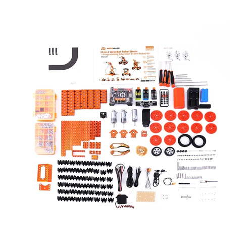 Weeemake 12-in-1 WeeeBot Robotstorm STEAM Robot Kit is a multi-functional DIY ultimate STEAM robot kit. It has more than 450 parts and contains 12+ cool pre-set forms. Whether you are a mechanical or an electronics engineer, a software engineer, a teacher a student, or a maker, this 12 in 1 WeeeBot RobotStorm STEAM Robot Kit allows you to easily learn robot-related mechanical structure, electronics, and programming knowledge, encouraging teamwork for robot competition.